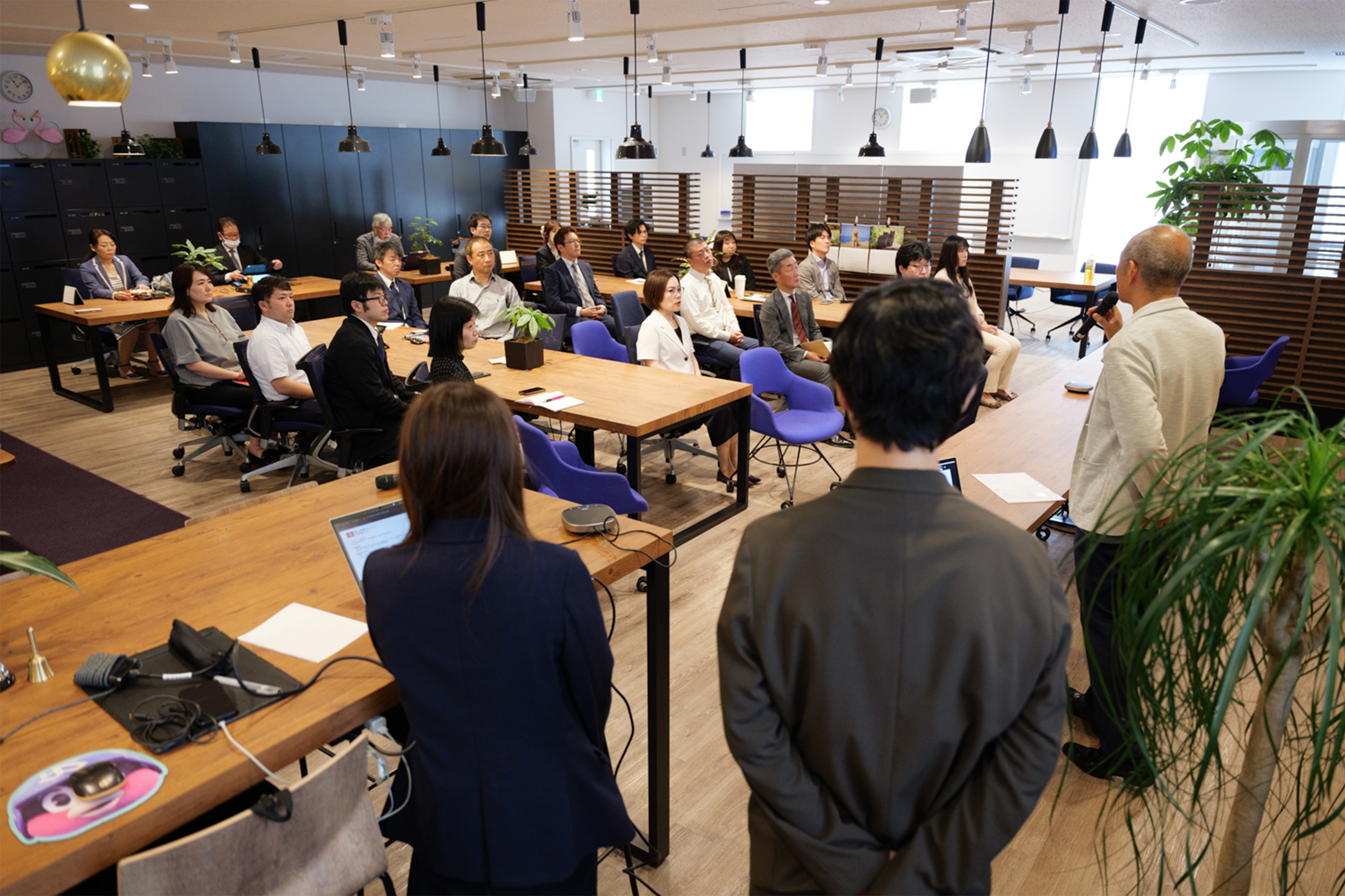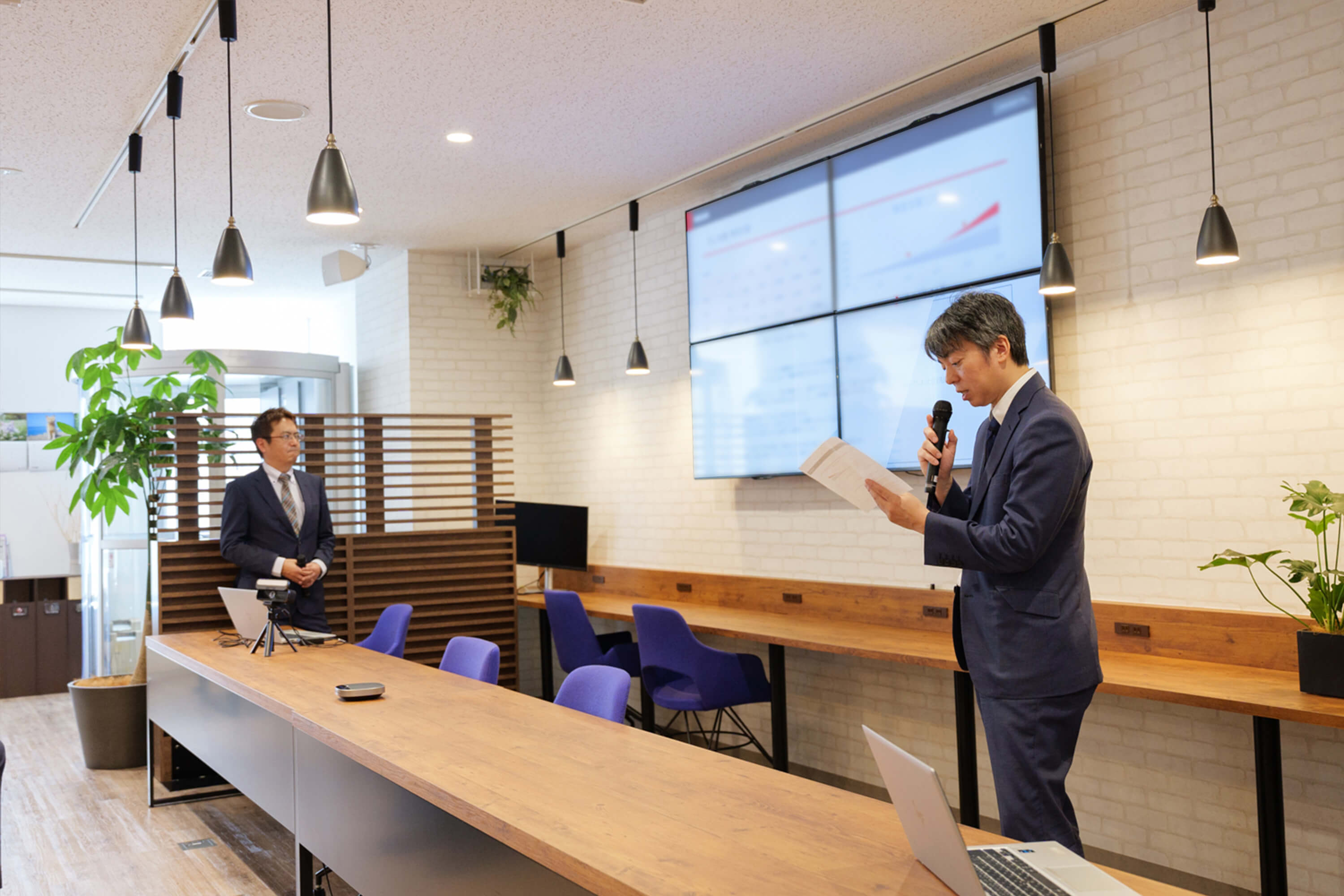 社長の岡本が、現在全社で開発を進めているBiz-marche(ビズマルシェ)の話や、今期の予算達成のためのポイントなど、会社の未来についての重要な話をします。